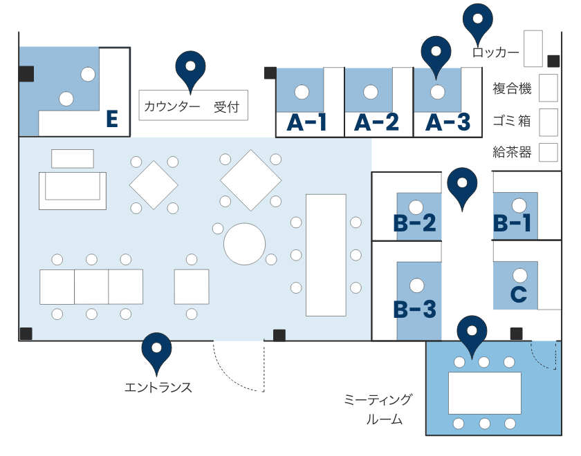 半個室ブースをご契約のお客様者専用のスペースを確保いただけます。ドアは施錠ができ、スペース内であればPCや書類、事務用品などはそのまま置いておくことができます。